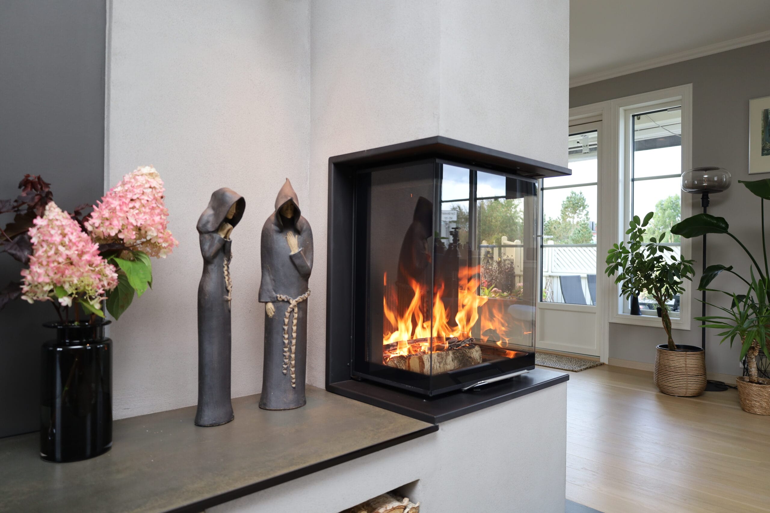 Heaven, 3 sidig peisinnsats, heve/senkedør, høyt glass, sort lakkert stein innvendig, rustfrie glassprofiler og avtagbart håndtak.