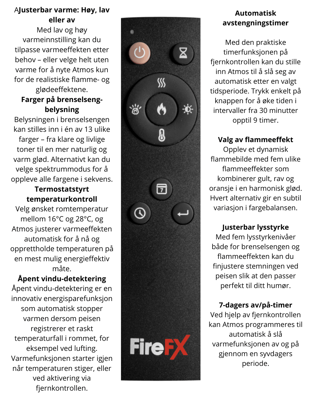 Ønsker du å nyte peisen kun for stemningens skyld? Atmos gir deg muligheten til å slå varmefunksjonen av eller på uavhengig av flammer og belysning i brenselsengen, slik at du kan nyte designet og atmosfæren hele året.