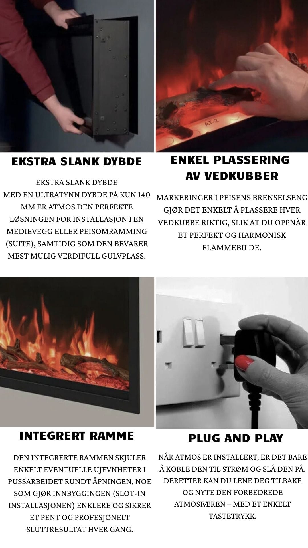 Atmos elektriske peiser har realistiske kunstige vedkubber plassert på en seng av sort glassmedia, som etterligner utseendet til en ekte peis. For ekstra autentisitet gløder deler av vedkubbene sammen med flammene og belysningen i brenselsengen, og gjenskaper følelsen av en ekte vedfyrt peis.